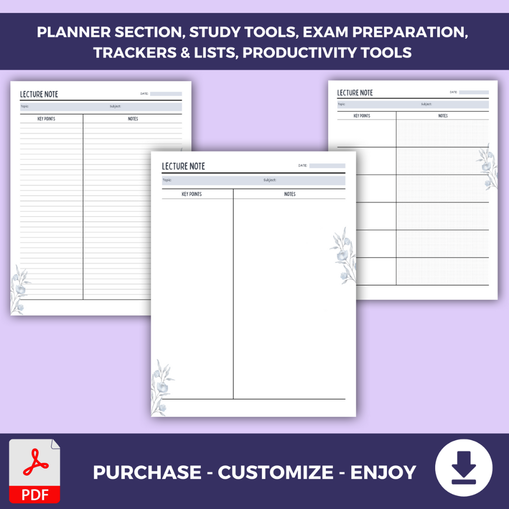 π Assignment Tracker: Effortlessly manage your assignments, projects, and exams with designated spaces for due dates, priorities, and progress tracking.
