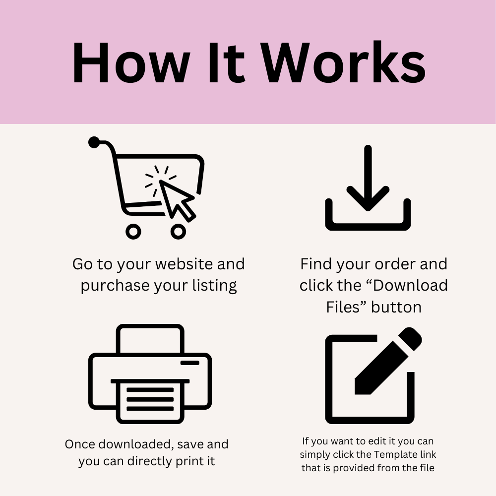 1 Pdf file that serve as your purchase guide towards the product. Note: • There are no physical or printed products that will be shipped. • Colors may vary slightly depending on the computer monitor and printer you decide to use. • This item is for personal use only. not to be resold, or redistributed, and not to use for any commercial purposes. Any queries? Please contact me via message! I am open to queries, comments, and suggestions.